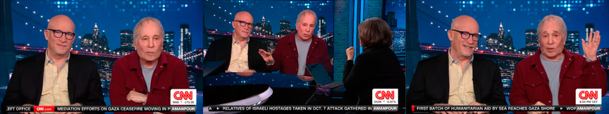 Comentarios: Paul Simon y Alex Gibney aparecen desde Nueva York via satelite en el programa de la CNN Amanpour and Company donde fueron entrevistados, durante casi 20 minuros, por Christiane Amanpour con motivo del estreno del documental In Restless Dreams: The Music of Paul Simon dirigido por Gibney del que se ofrecen varios fragmentos..