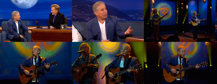 Comentarios: Celebrando la Semana George Harrison en el programa de televisión Conan, Paul Simon con la ayuda de Mark Stewart interpretó "Here Comes The Sun". Tambien es entrevistado por Conan O'Brien contando sus visitas a Friar Park, la mansión de Harrison, "Era un placer pasar el rato con el", "Tenía un montón de ukeleles," dice. "Le encantaba tocar el ukelele. Así que simplemente te daba uno y te decia, Vamos a tocar. Tambien tenía una gran jukebox, llena de toda la música que escuchaba cuando era un niño". Y termina con una graciosa anecdota. Admirando las formaciones de roca que tenia en su propiedad, Harrison le contó a Simon que le había gastado una broma a Ringo Starr en una de sus visitas, diciendole que eran un regalo promocional de Paul McCartney de su álbum de música clásica de 1997 "Standing Stone" (aparecían las rocas en la portada). A lo que Ringo contestó "que cabrón, a mi no me las ha enviado!".