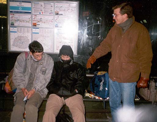 Ante la incertidumbre de dónde pasar la noche, Vicente les aconsejó una estación de ferrocaril cercana; desde luego, mucho más que la de Austerlitz, a la que llegaron desde Madrid. Sin embargo, ya solos los cuatro, y recorrido el trayecto hasta la estación, comprueban que está cerrada. Así que, de momento, nada más a mano que una parada de autobús. Allí se sientan Alberto y Aitor, clavando la barbilla en el pecho. Paco, realmente preocupado, se altera más por momentos. Javi se ríe de la situación, probablemente, para evitar la preocupación. Alberto y Javi se alejan un poco para tratar de buscar, algo, un portal, un... donde sea. Pero lo único que ven es el aspecto de sus dos amigos a lo lejos. Desde ese momento pierden el miedo a un robo; no creen que nadie tenga el valor de acercarse. La verdad es que hace un frío al que no están acostumbrado. Javi, por ejemplo, lleva puesto: un jersey grueso de cuello vuelto, la camiseta de Paul Simon, una camisa de algodón, otro jersey, el chaquetón, la bufanda y los guantes. Y aún así... ¡tela!.