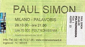 Un caluroso aplauso acogió a Paul Simon en el escenario del Palavobis milanés, mientras se elevaban al cielo los mágicos acordes iniciales de That's where I belong. Así comenzaba el excepcional concierto -el único de Simon en tierras italianas- de un músico cuya obra atesora y funde las corrientes más vitales de la música popular de los últimos 50 años, y que constituye -por su particularidad, maestría y autenticidad- una corriente en sí mismo. Desde el folk al gospel, desde el funk a la música latina, desde el R&B a la música new age, desde el country o el hard-rock al jazz a los ritmos hipnóticos, desde las músicas afroamericanas hasta los sonidos orientales: todo eso, ni más ni menos -expresado en piezas de deslumbrante calidad- estuvo presente en el Palavobis Auditórium durante las casi dos horas y media que duró su actuación.
