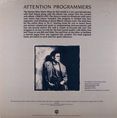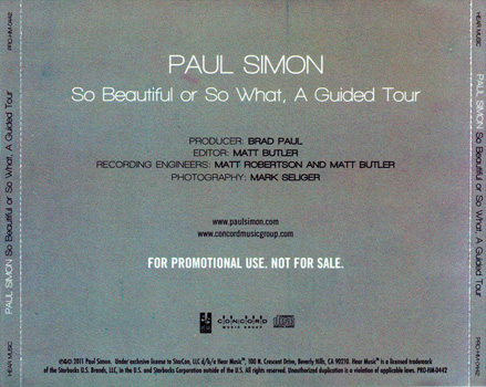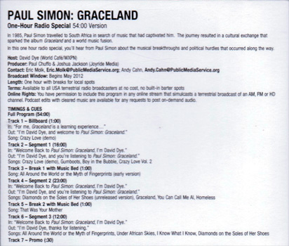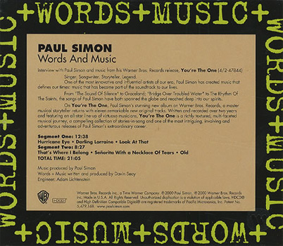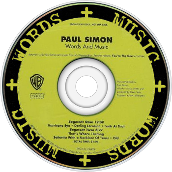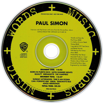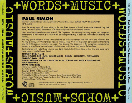 ![]() ![]() Doble LP promocional distribuido en emisoras de radio en 1986 con una entrevista a Simon y canciones de Graceland. Ref: WBMS 140 Entrevista de Davin Seay, producido por Larry Butler, editado por Terry Dunavan y Mark Graue ![]() ![]() Aunque no se trata de un lanzamiento oficial, reseñamos este curioso picture disk editado en inglaterra por Baktabak (BAK 2153) con titulo Paul Simon The Graceland Story. ![]() ![]() CD promocional de 1997 con una entrevista a Paul Simon sobre "Song From The Capeman". Ref: Warner Bros. PRO-CD 9034. Escrito y producido por Davin Seay, Ingeniero: Keith Blake. ![]() ![]() CD promocional de 2000 con una entrevista a Paul Simon sobre "You're The One". Ref: Warner Bros. PRO-CD 100438. Escrito y producido por Davin Seay, Ingeniero: Adan Litchtensein. ![]() ![]() Cd promocional de 2011 con una entrevista a Paul Simon sobre "So Beautiful or So What". Hear Music – PRO-HM-0442 ![]() ![]() Cd promocional de 2012 editado por Sony Music a traves del sello Joyride Media con una entrevista a Paul Simon a cargo de David Dye. Produciso por Joshua Jackson y Paul Chuffo. |