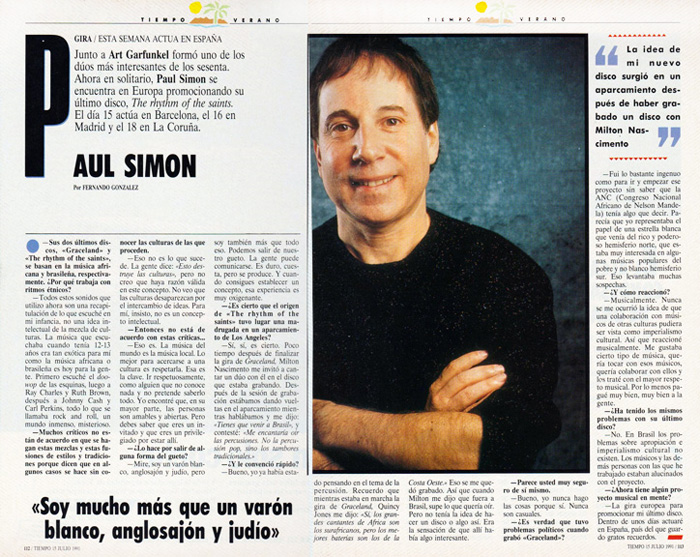Junto a Art Garfunkel formó uno de los dúos más interesantes de los sesenta. Ahora en solitario, Paul Simon se encuentra en Europa promocionando su último disco, The rhythm of the saints. El día 15 actúa en Barcelona, el 16 en Madrid y el 18 en La Coruña.