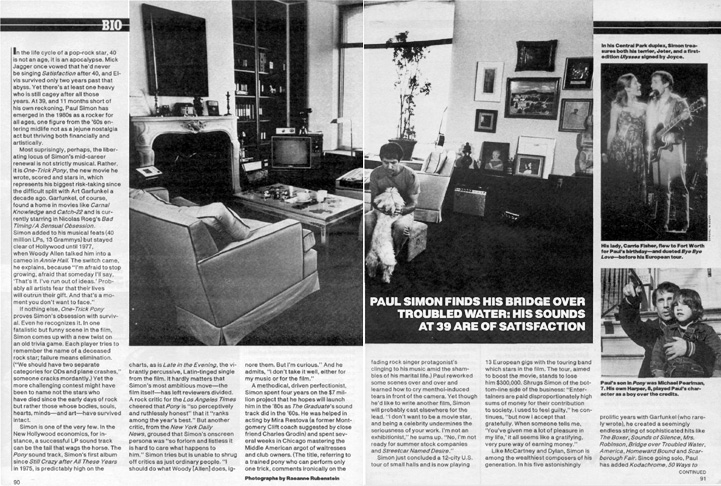 Simon es uno de los pocos. En la economía de New Hollywood, por ejemplo, un LP de éxito de una banda sonora puede ser el pequeño detalle que le catapulte. La banda sonora de Pony, el primer disco de Simon desde Still Crazy After All These Years de 1975, es previsible que llegue alto en las listas, como Late In The Evening, el vibrante single de percusión con toque latino de la película. No importa que el movimiento más ambicioso de Simon -la película es si misma- haya dejado a los que la han visto divididos. Un crítico de rock de Los Angeles Times aplaudió que Pony es "tan perceptiva e implacablemente honesta" que "está entre las mejores del año". Pero otro crítico del New York Daily News se quejó de que el personaje de Simon era "tan desamparado y apático, que es difícil preocuparse de lo que le suceda". Simon trata, pero es incapaz de ignorar a los críticos como si fueran personas comunes. "Debo hacer lo que Woody [Allen] hace, ignorarlos. Pero tengo curiosidad". Y admite, "No me lo tomo bien, ya sea por mi música o por la película".