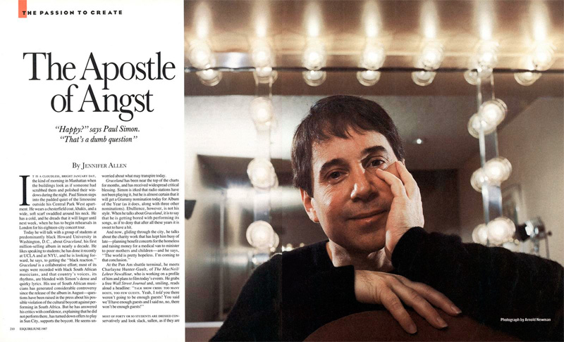 Hoy hablará con un grupo de estudiantes, predominantemente negros, de la Universidad Howard, en Washington, D.C., sobre Graceland, su primer álbum con un millón de ventas en casi una década. Le gusta hablar con los estudiantes; lo ha hecho recientemente en UCLA y en NYU, y espera, dice, obtener la "reacción negra". Graceland es un esfuerzo colaborativo; la mayoría de sus canciones fueron grabadas con músicos sudafricanos negros, y las voces de ese país, sus ritmos, se mezclan con las letras densas y peculiares de Simon. Su uso de músicos sudafricanos ha generado una controversia considerable desde el lanzamiento del álbum en agosto; se han planteado preguntas en la prensa sobre su posible violación del boicot cultural contra las actuaciones en Sudáfrica. Pero ha respondido a sus críticos con confianza, explicando que no actuó allí, ha rechazado ofertas para tocar en Sun City, apoya el boicot. No parece preocupado por lo que pueda suceder hoy.