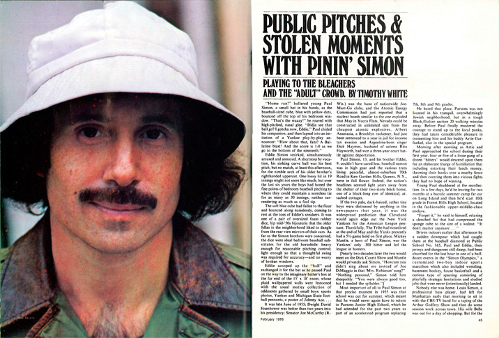 "El béisbol, sin embargo, eso era lo más importante para mí", reflexiona Simon con una risa débil y melancólica. "Puedo recordar, claro como el agua, estar sentado en el regazo de mi padre en nuestra sala de estar escuchando un partido de los Yankees de 1947 en la radio: vaya, amaba a los Yankees. Mi padre una vez me llevó a un partido de los Dodgers en el Ebbets Field, en 1949, y estaba tan avergonzado de estar allí que me puse una máscara del Llanero Solitario para que nadie me reconociese”.