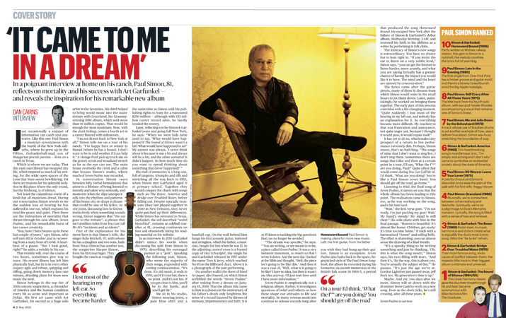 Nos sentamos en su estudio, Simon usa jeans, una camisa azul claro y una gorra de béisbol. En la pared detrás de él cuelga su primera guitarra acústica, maltratada y sin cuerdas, que su padre, un músico, le compró cuando tenía 12 años. En la sala de control contigua hay una copia enmarcada de Hey Schoolgirl, el sencillo que él y Garfunkel lanzaron en 1957 bajo el nombre de Tom & Jerry, que alcanzó el puesto 49 en la lista Billboard. Arriba hay una fotografía de la pareja actuando.