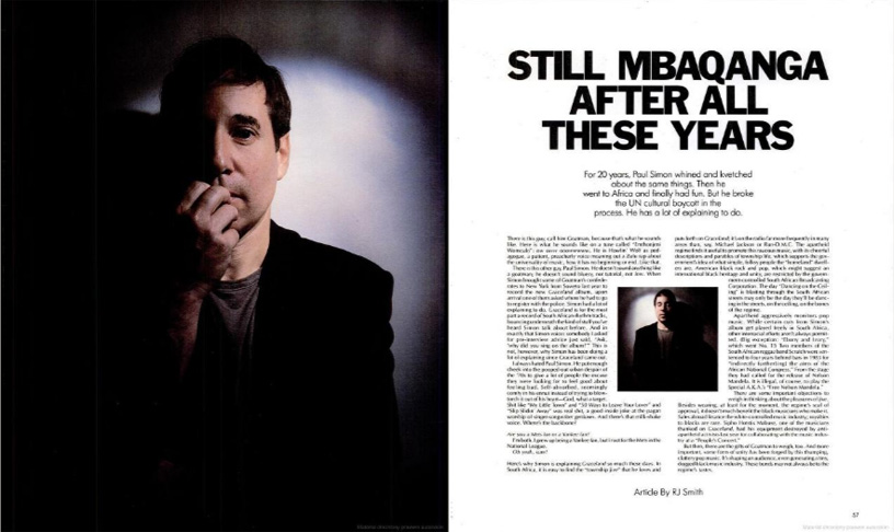 Graceland es, en su mayor parte, un disco de pistas rítmicas sudafricanas, con un estilo diferente al que ya has oído hablar antes a Simon. Y exactamente con esa voz de Simon: alguien a quien pedí consejo antes de la entrevista se limitó a decir: "Pregunta: "¿por qué cantas en el disco?"". Sin embargo, esta no es la razón por la que Simon ha estado dando muchas explicaciones desde que salió Graceland.