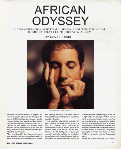 "Nunca me habría metido en esto si no hubiera perseguido enérgicamente los orígenes de una copia de una copia de un casete", explica Simon mientras rasguea distraídamente una guitarra acústica en la espaciosa comodidad de su oficina del centro de Nueva York, situada en el Brill Building, la meca de los compositores pop de finales de los cincuenta y principios de los sesenta. Al otro lado de la habitación, entre el caos de cuadros, fotografías y recuerdos de béisbol que adornan las paredes y los alféizares de las ventanas, hay una copia enmarcada de su éxito de 1957 en Big Records, "Hey, Schoolgirl", que grabó con su compañero de colegio Art Garfunkel bajo el nombre de Tom y Jerry. Graceland está a un océano y tres décadas de distancia de los humildes comienzos de Simon como alumno de Queens con ansias de rock & roll. Pero tras su tormentosa gira de reunión con Garfunkel en 1982, la ruptura de su segundo matrimonio (con la actriz Carrie Fisher) y el sorprendente fracaso de su álbum Hearts and Bones de 1983, Paul Simon estaba preparado para una especie de viaje musical épico.