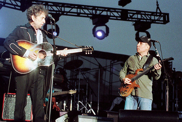 Paul Simon junto a Bob Dylan durante su gira conjunta de 1999.