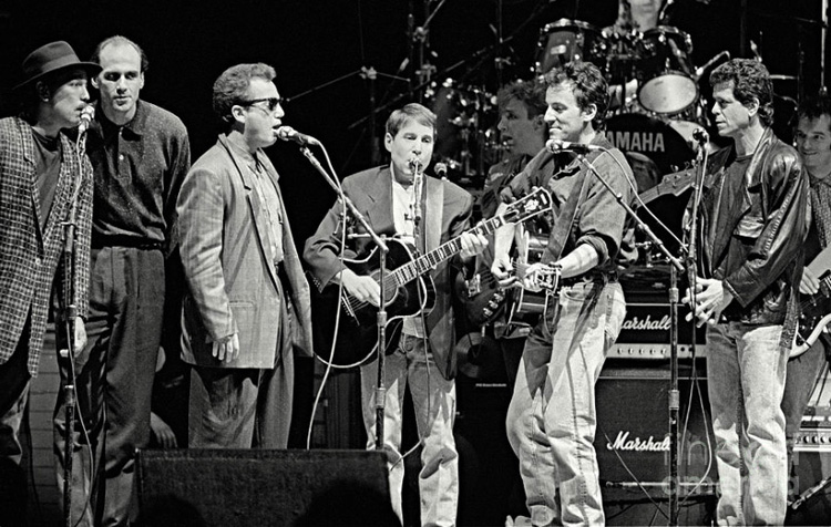 Ruben Blades, James Taylor, Billy Joel, Simon, Bruce Springteen y Lou Reed en un concierto benéfico en el Madison Square Garden, NYC. 1987.