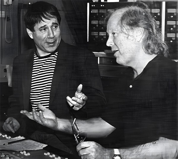 Junto al productor Roy Halee durante la grabación de "The Rhythm of The Saints". 1990
