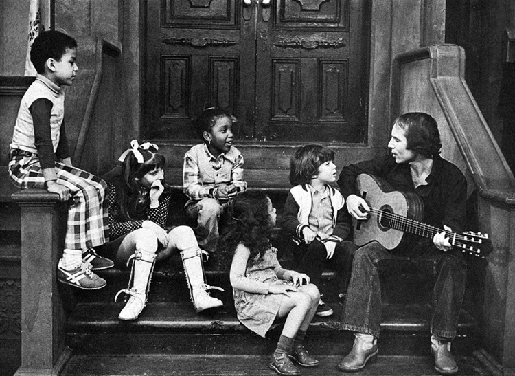 Paul Simon en el programa "Barrio Sésamo". Sentado a su lado, su hijo Harper. 1976