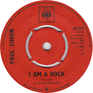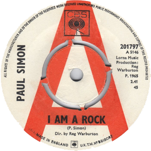 Dos versiones del Reino Unido y la holandesa (derecha) Single de The Paul Simon Song Book, solo editado en Reino Unido y en los Paises Bajos. La versión que escuchamos de I Am A Rock no es la versión del Song Book. Mientras en el LP escuchamos la toma 4 del 17 de junio de 1965, en este single escuchamos una regrabación del 23 de junio (toma 6). Esta última está disponible como una "versión alternativa" en el CD "The Paul Simon Song Book" de 2004. |