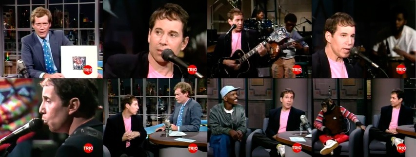 Comentarios: Paul Simon acude para presentar su nuevo disco disco del que interpreta "Graceland" para después ser entrevistado por Letterman. Ray Phiri, músico de Graceland, se une a la entrevista más tarde.