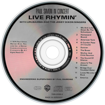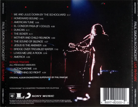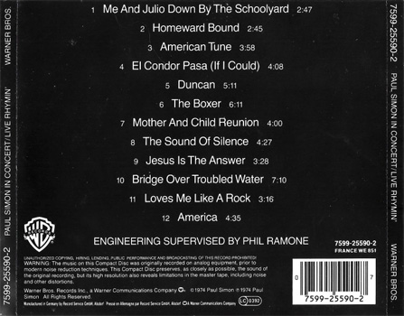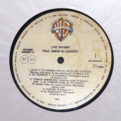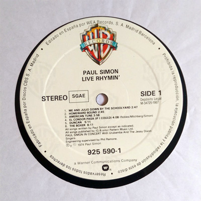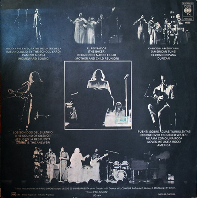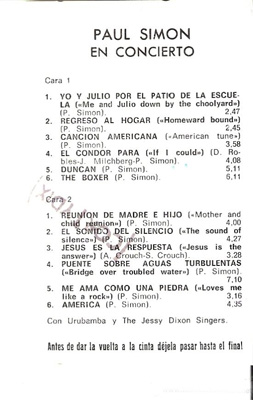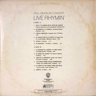 Como curiosidad tenemos la versión del LP lanzada en Argentina con el nombre de "Paul Simon en Concierto" y los títulos de las canciones en español escritos en la portada. Una rareza.