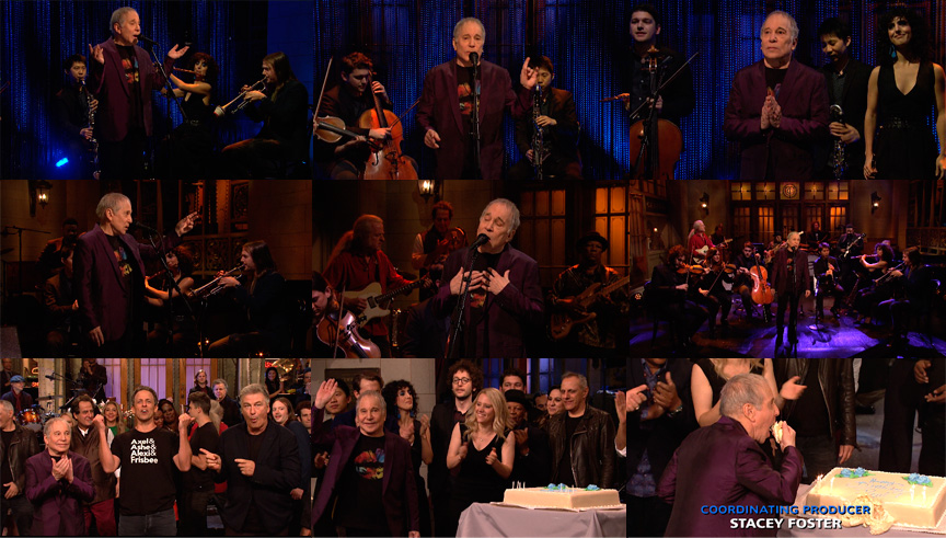 Comentarios: El día de su 77 cumpleaños, Paul Simon volvió a pisar el plató de Saturday Night Live en su novena aparición musical, más que ningún otro artista en la larga historia del programa, quince en total en el show. Para esta ocasión y con motivo de la presentación de su último disco, Simon interpretó junto a yMusic "Can’t Run But" y el nuevo arreglo de "Bridge Over Troubled Water" de Gabriel Kahane que habia estado interpretando durante sus conciertos en la gira de despedida.