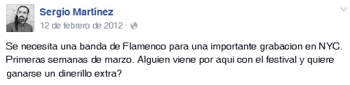 Sergio se pone en contacto con Nino de los Reyes, bailaor nacido en Boston (Sus padres, artistas flamencos, se trasladaron allí para fundar el Spanish Dance Theatre) y con el también bailaor sevillano Oscar de los Reyes, que actuaba en el Flamenco Festival de Nueva York por esa fecha formando parte del cuadro flamenco de Manuela Carrasco.