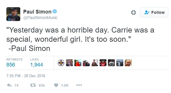 Al día siguiente las esperadas declaraciones de Simon vieron a la luz en forma de un mensaje en Twitter en el que decía lo siguiente: "Ayer fue un día horrible. Carrie era una chica especial y maravillosa. Es demasiado pronto".