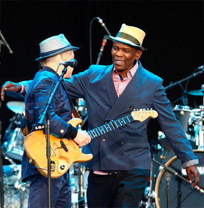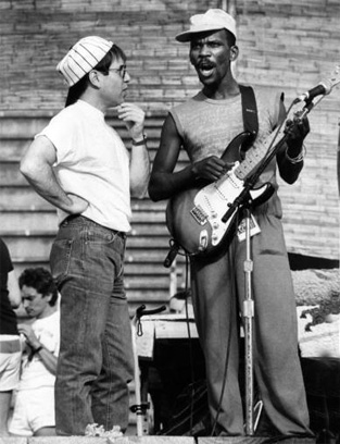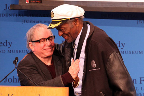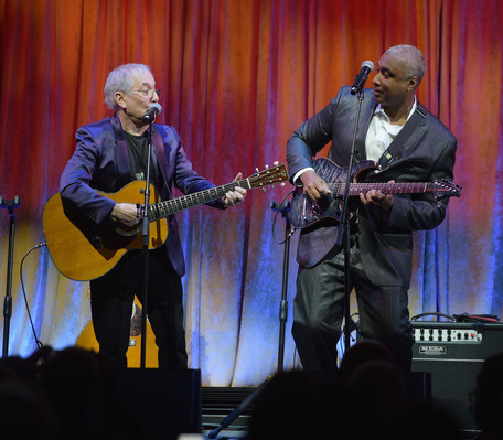![]() ![]() "Yo diría que ningún compositor influenció tanto a mi generación como Chuck Berry. "En lo profundo de Louisiana cerca de Nueva Orleans / Camino de regreso por el bosque entre árboles de hoja perenne / Allí había una cabaña hecha de tierra y madera / Donde vivía un muchacho de campo llamado Johnny B. Goode" Para mí, era como un lugar mágico escuchar esta descripción de la América rural. Era como del tipo de cosas de Zora Neale Hurston - un trozo asombroso de escritura para los años 50 y algo que dejó una poderosa impresión en mí, que apenas comenzaba a tocar la guitarra". Abajo Paul Simon y Chuch Berry en 2012 durante el Awards For Lyrics Of Literary Excellence.
