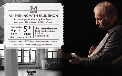 ![]() Abril 2017 El 5 de abril tuvo lugar en The Warehouse de Nueva York, la gala de apoyo a la iniciativa Materials for The Arts que llevó por título "An Evening with Paul Simon" Donde Simon interpretó clásicos de su repertorio junto a la ayuda de Mark Stewart y el percusionista Skip LaPlante que tocó una colección de campanas de viento construidas con materiales reciclados. "Homeward Bound" "Mystery Train"/ Me and Julio", "Here Comes the Sun", "Duncan", "Mrs. Robinson", "The Boxer", "The Sound of Silence", "Feeling Groovy" y "Questions for the Angels" fueron algunos de los temas que interpretaron. Materials for The Arts colecciona artículos innecesarios de negocios e individuos, y hace que estas donaciones estén disponibles gratuitamente para sus destinatarios: organizaciones sin fines de lucro con programación de arte, agencias gubernamentales y escuelas públicas.