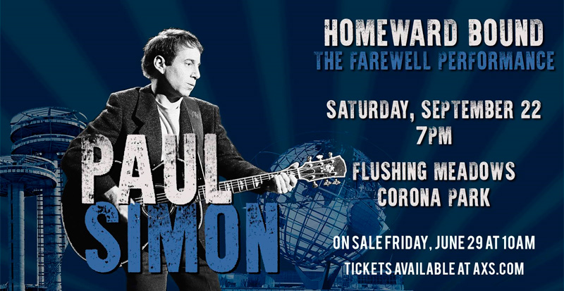 Ese mismo día se dio a conocer la ubicación de su último concierto que se había mantenido en suspense hasta la fecha. Sera el 22 de Septiembre en el Flushing Meadows Corona Park de Queens, Nueva York, el segundo parque público más grande de la ciudad después del Central Park en Manhattan. En un breve comunicado Simon ha declarado “Parece más el destino que la coincidencia de que debería hacer el último show de esta gira de despedida en el Flushing Meadows Corona Park. Podía ir en bicicleta desde mi casa hasta el parque en unos 20 minutos cuando era un niño. Pero esto es menos un adiós que una despedida. Gracias a todos por el viaje, lo pasé muy bien”.