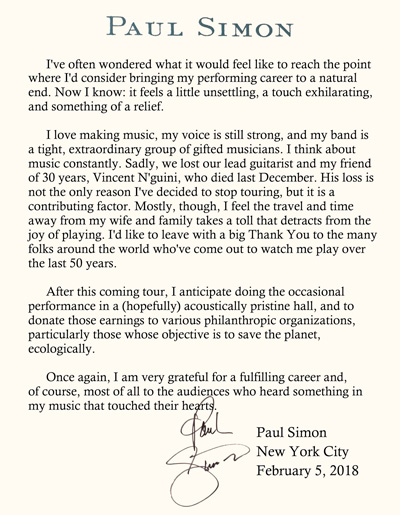 Febrero 2018 El 5 de Febrero se publicó a través de todas sus redes sociales un comunicado firmado por Paul Simon dirigido a todos sus fans de todo el mundo donde manifestaba su intención de dejar de hacer giras. El comunicado y su traducción los puedes ver abajo.