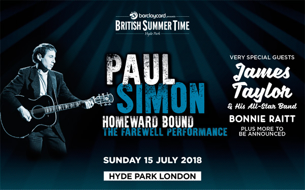 Enero 2018 El 30 de enero saltaba la noticia en todos los medios, españoles incluidos, sobre el anuncio del último concierto de Paul Simon. Según la noticia los organizadores del festival British Summer Time que tendrá lugar este verano en Hyde Park de Londres anunciaron este concierto como su "actuación de despedida". El evento que tendrá lugar el domingo 15 de julio lleva el título de "Homeward Bound, The Farewell Performance" contara con invitados especiales como James Taylor y Bonnie Raitt mas alguno más por confirmar.