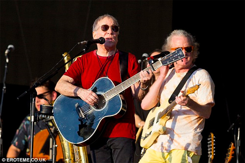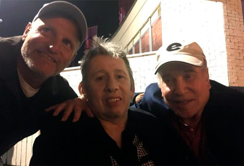 Abajo Simon durante su actuación en Hyde Park y junto a Shane MacGowan ex líder de Pogues y Woody Harrelson después de su concierto en Irlanda.