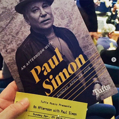 El 29 de abril Paul Simon actuó en el Distler Performance Hall de la Tufts University ante una audiencia privada de unas 300 personas, estudiantes de música de la universidad. Fue acompañado por Mark Stewart en la guitarra acústica y el chelo. Empezó el set con "America" tras la cual Simon comento: "Actué aquí con Artie en 1967, así que estoy tocando canciones de 1967", para seguir con "Homeward Bound", "The Sound of Silence", “Mother and Child Reunion”, “Me and Julio Down by the Schoolyard”, “American Tune”, “Here Comes the Sun”, “Questions for the Angels” "Mystery Train / Mrs. Robinson", tras la cual se dirigió al público pidiendo peticiones y contó una anécdota sobre una mujer que lloraba copiosamente y que solicitaba una canción en uno de sus conciertos. Simon dijo que no podía entender la petición de la mujer a través de sus lágrimas y asumió que ella podría haber estado pidiendo una canción de Paul Simon que tuviera un profundo significado personal. Finalmente se dio cuenta de que la mujer estaba diciendo "¡Por favor, toca 'The Lion King'!". Acabo el concierto de 45 minutos con "The Boxer"