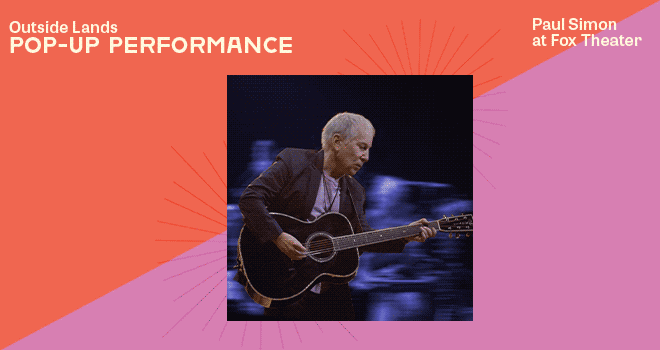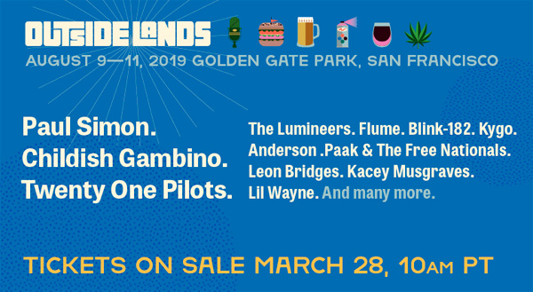 Marzo 2019 Este 2019 regresará a San Francisco el Festival de Música Outside Lands, al Golden Gate Park del 9 al 11 de agosto. Los organizadores dieron a anunciar a los artistas que serán parte de esta edición y que incluye a Paul Simon como cabeza de cartel el último día. Así pues se confirman los planes de Simon después de su anuncio de dejar las giras, hacer actuaciones esporádicas de carácter benéfico. "Tengo muchas ganas de tocar en el Golden Gate Park este verano. Esta será mi primera aparición allí, y es un honor unirme a la larga lista de músicos que le han dado al parque un consagrado patrimonio musical" dijo Simon en un comunicado. "Estoy igualmente contento de estar tocando en San Francisco con su merecida reputación de estar a la vanguardia de los problemas ambientales. Estoy agradecido por la oportunidad de estar al servicio de esta causa vital”. Según informa el San Francisco Chronicle los organizadores anunciaron que Simon donaría todas sus ganancias del concierto a una organización local sin fines de lucro.