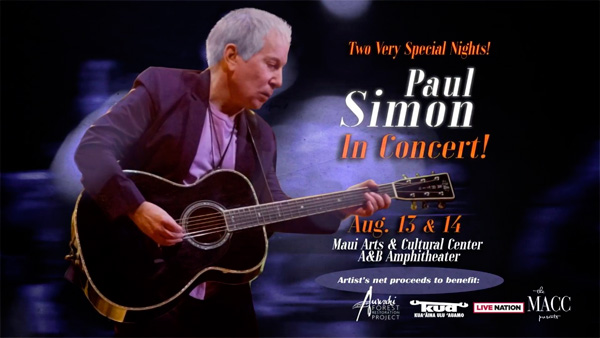 Mayo - junio 2019 Paul Simon ha anunciado dos conciertos consecutivos en Maui, Hawái, el 13 y 14 de agosto. Las actuaciones se llevarán a cabo dos días después de que Simon encabece el Festival Outside Lands de San Francisco, su primer concierto desde que terminó su tour de despedida en su ciudad natal de Queens, Nueva York, en septiembre del año pasado. Simon ya declaro que las actuaciones esporádicas que cometiera a partir de su retirada de las giras serian para apoyar causas benéficas, así los espectáculos de Maui serán en apoyo de la conservación de la biodiversidad, su mayor preocupación en estos momentos. Las ganancias netas se donarán al Proyecto de Restauración de Bosques de Auwahi y Kua’āina Ulu 'Auamo (KUA), mientras que las ganancias de Outside Lands se entregarán a la Alianza de Parques de San Francisco y Amigos del Bosque Urbano. Las actuaciones no solo marcarán la primera vez que Simon actuará en Maui, sino que también será la primera vez que se presentará en Hawái en 51 años. Él y su antiguo socio Art Garfunkel actuaron en el HIC Arena de Honolulu el 24 de agosto de 1968.