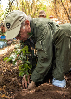 ![]() ![]() ![]() Simon insertó la planta y un pergamino en la tierra y habló con los miembros del grupo, "Incluso sentarme con ustedes y estar en la misma comunidad es un privilegio", dijo Simon, que conoció a los ambientalistas y su proyecto hace un tiempo después de visitar Hoʻolawa Farms, un vivero situado en Maui para ver una planta de kanaloa rara, una de las dos únicas que existen en el mundo. Simon expresó su asombro por estar en la reserva forestal después de crecer en la muy urbanizada Nueva York, y solo preocuparse por el "stickball y la música". "Es algo que nunca podría haber imaginado", dijo Simon.