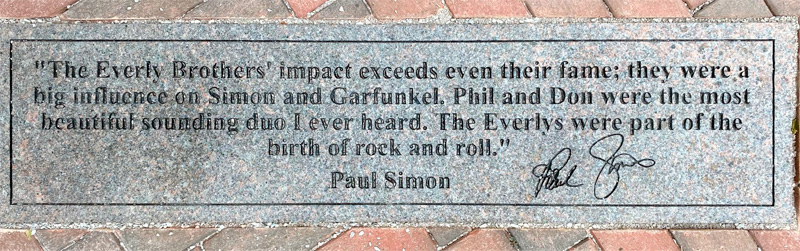 ![]() Bob Dylan, Paul McCartney, Brian Wilson, Keith Richard o el ex compañero de Simon, Art Garfunkel son algunos de los otros muchos artistas que han mandado sus citas y sus firmas para que formen parte del suelo del parque. Abajo la placa de Paul Simon donde ha dejado escrito: "El impacto de los Everly Brothers supera incluso su fama; fueron una gran influencia para Simon y Garfunkel. Phil y Don eran el dúo con el sonido más hermoso que jamás haya escuchado. Los Everly fueron parte del nacimiento del rock and roll".
