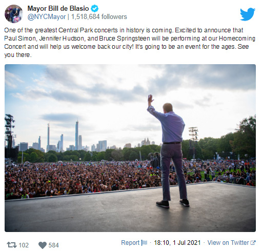 ![]() Julio 2021 "Se acerca uno de los mejores conciertos de Central Park de la historia. ¡Emocionado de anunciar que Paul Simon, Jennifer Hudson y Bruce Springsteen se presentarán en nuestro concierto de regreso y nos ayudarán a dar la bienvenida a nuestra ciudad! Va a ser un evento para todas las edades. Te veo allí". Con este mensaje colgado en sus redes sociales, el alcalde de Nueva York, Bill de Blasio, anunció el día 1 de julio la celebración de un mega concierto que según comentó en una videoconferencia ese mismo día "Va a ser uno de los más grandes conciertos en Central Park de la historia" y que el evento, con fecha fecha aun no confirmada (varios medios apuntan al 21 de agosto) marcará el regreso de la ciudad de Nueva York a la normalidad después de la pandemia del Coronavirus. De Blasio que ha pedido al legendario productor Clive Davis que encuentre ocho intérpretes para el espectáculo de tres horas describió a Simon como un "hijo de Queens", señalando que el famoso compositor tiene una historia histórica en Central Park: su actuación de 1981 con Art Garfunkel, y su concierto individual una década más tarde. De Blasio prometió más detalles, incluyendo la alineación completa de artistas, en las próximas semanas.