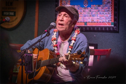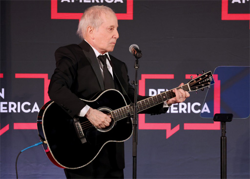 Mayo 2024 Paul Simon fue uno de los galardonados este año en la gala anual de PEN America, que se celebró el 16 de mayo en el Museo Americano de Historia Natural de Nueva York. Simon recibió el premio PEN/Audible Literary Service Award por sus abundantes e incomparables canciones y letras a lo largo de medio siglo. El autor de bestsellers Malcolm Gladwell entregó el premio literario a Simon, diciendo que el compositor "ha proporcionado la banda sonora de mi vida y creo que eso es cierto para millones de nosotros en todo el mundo". Gladwell agregó que Simon era un cruce entre "un genio y el tipo de Queens en las gradas gritando '¡Estaba fuera!'”. Por su parte Simon dijo: "Hemos aprendido que la causa que estamos apoyando esta noche, el compromiso válido de PEN de proteger a los escritores de todo el mundo de la censura, la coerción y el encarcelamiento, se necesita con más urgencia que nunca. ¿Qué podemos hacer frente a estos problemas aparentemente montañosos? En el peor de los casos, nos asomaremos a un abismo cultural y político. Eso no va a suceder", agregó, citando versos de la poetisa premio Nobel Wisława Szymborska: "un abismo, pero un pequeño puente, un pequeño puente, pero tembloroso, tembloroso, pero el único, no hay otro". "Tendremos que construir ese puente", dijo Simon. "No hay otra opción para nosotros. Tenemos los recursos para hacer del futuro un lugar mejor. El arte es un arma de paz. Cuando nos volvamos a encontrar dentro de 50 años, habrá alguna otra melodía estadounidense (American Tune) que describa una época más optimista en nuestro país. Ese será su legado". A continuación, Simon, guitarra acústica en mano interpretó "American Tune", que escribió en 1972 después de la elección de Richard Nixon y con los tiroteos de manifestantes estudiantiles en la Universidad Estatal de Kent frescos en su mente. "El estado de ánimo hoy es incómodamente similar al de esa época", dijo. La multitud se conmovió con su canto tranquilo, casi trascendente.