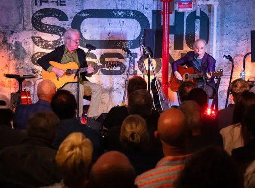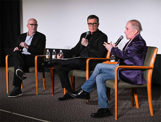 ![]() Unos días antes, el 13 de marzo tuvo lugar en el DGA Theater de Nueva York, organizado por MGM+, un pase especial de la primera parte del documental tras la cual Paul Simon y el director Alex Gibney ofrecieron una charla moderada por Stephen Colbert. La mejor noticia fue la confirmación por parte de Simon de que parte de su audición había regresado. "Ahora escucho lo suficiente como para poder cantar, tocar la guitarra y algunos otros instrumentos. Puedo oír mi voz como quiero en el contexto de la música. Aún tengo dificultades cuando tocan una batería o una guitarra eléctrica, está demasiado alto y no oigo mi voz. Pero cuando perdí el oído por primera vez, no lo conseguía, me desconcertaba" y añadió: "El mes que viene, voy a tratar de hacer un ensayo con todo el conjunto de Seven Psalms... Veré si puedo cantarla durante 35 minutos y escucharla bien. Soy optimista en que podre hacerlo". Después de que Simon admitiera que aún no había visto In Restless Dreams, Colbert le preguntó si había visto alguna de las otras películas de Gibney, Simon dijo que le "encantó" la serie de dos partes de HBO, Sinatra: All or Nothing at All, lo que llevó a Colbert a preguntarle si alguna vez había conocido a Frank Sinatra. Dijo que sí, pero la pregunta terminó provocando una anécdota sobre la versión que grabó Sinatra en 1969 de "Mrs. Robinson". "Cambió la letra", recordó Simon, señalando la sustitución de "Jesús" en la versión de Sinatra, pasando a decir: 'Y esto es para ti, Mrs.Robinson / Jilly te ama más de lo que crees'... Le dije: "¡No puedes hacer eso!, Voy a detener la grabación". Después de amenazar con emprender acciones legales, Simon dijo que finalmente cedió cuando un ejecutivo de Warner Bros lo llamó y emitió una petición de clemencia. Con el tiempo, la respuesta inicialmente fría de Simon se descongeló por completo. "En años posteriores, me enamoré de esa grabación", dijo, puntuando su recuerdo con una floritura de big band. "¿Sabes la música que suena después de que termine uno de mis conciertos? Esa es la primera canción que suena. '¡Ba-da-ba-BAH!'. Colbert también le preguntó por el clásico de Simon & Garfunkel, "Feeling Groovy", que a Simon no le gusta, “Contiene una línea que odio, a medida que se acerca, pienso: 'Aquí viene, aquí viene': 'Vida, te amo'. ¡Ugh! 'Todo es genial'. ¡Vaya!" Simon recordaba con evidente desdén tener que "cantarla con Artie todo el tiempo porque era un éxito. En mis propios conciertos, no la canto a menos que cometa un error y lo hago para castigarme a mí mismo". Para concluir el día MGM+ invito a un coctel en una fiesta en el pub The Pool de Manhattan, donde se pudo ver a los tres hijos pequeños de Simon.