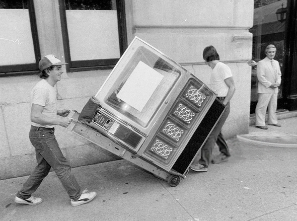 Dos operarios cargan el Juke Box regalo de boda de Billy Joel para Carrie Fisher y Paul Simon. 1983