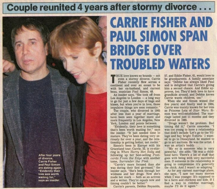 Ellos chapurrearon algo de español y se entendieron “muy bien por señales”, “recuerdo que ella me dijo que no debería estar allí, que debería estar rodando con Spielberg“. Luci parece estar en lo cierto, de hecho Carrie Fisher cogió un vuelo desde Los Angeles a Londres para reunirse con Simon, según un artículo aparecido en la prensa norteamericana, pero en Londres no había programada ninguna fecha en ese tour, por lo que puede que cogiese ese avión para participar en la película Hook de Steven Spielberg que comenzó su preproducción por esas fechas (Fisher aparte de ayudar a reescribir parte del guion aparece en un cameo junto a George Lucas frente al Big Ben) y lo dejase de lado un tiempo por estar con Paul Simon, del que recordamos llevaba separada cinco años pero en ese intervalo lo volvieron a intentar en alguna ocasión. Este verano de 1989 fue la última oportunidad para intentar recuperar el amor. Puede también que el viaje a Londres fuese para hacer escala en Málaga o alguna otra ciudad por donde paso la gira, no estamos seguros pero la historia cuadra.