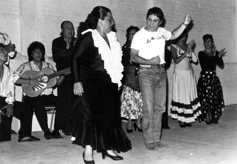 Tras más de 3 horas de espectáculo (Aquí puedes leer la crónica del Diario Sur) el ayuntamiento le tenía preparada una sorpresa, una improvisada "juega" flamenca organizada en una carpa detrás del escenario de La Rosaleda. Allí se dieron citas muchos flamencos malagueños como Luci Montes y su marido el bailaor Mariano, Pepa Vargas, El Yaya o El Duende entre otros muchos, pero uno destaca en las imágenes y nos es muy familiar, ni más ni menos que el gran Chiquito de la Calzada en pleno apogeo flamenco, lejos aún de la estrella del humor en la que se convertiría unos años después.
