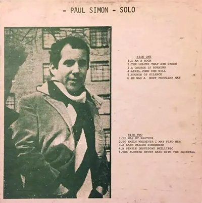 Comentarios: Pirata publicado en mayo de 1971 por Trade Mark Of Quality (TMOQ 71014) Incluía The Paul Simon Soongbook de manera desordenada, disco que por aquel entonces no estaba disponible en Estados Unidos y fue la primera vez que muchos fans pudieron escucharlo. No se incluía ningún tipo de texto ni aclaración ni en la contra ni en las etiquetas de los vinilos que salieron con variedad de distintos colores.