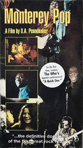Publicado en video VHS en 1985 Comentarios: Video que recoge la película-documental dirigida por D.A. Pennebaker sobre el Festival de Monterey de 1967 y que fue estrenado en cines en Diciembre de 1968. La cadena de televisión ABC tenía los derechos de emisión de la película pero se negó a emitirla debido a que consideraban obscena su interpretación de Jimi Hendrix de "Wild Thing". Escena ahora mítica de la historia del rock que culmina con el incendio de su guitarra.
