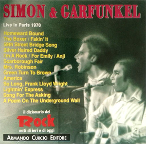 Comentarios: Disco italiano perteneciente a una colección de fascículos que recoge la actuación de Simon & Garfunkel en Paris en Mayo de 1970, aparte de su magnifico sonido, lo mas destacable de este disco es que podemos escuchar una canción inédita hasta ahora, "Lightnin' Express" de los Everly Brothers, no disponible en otro sitio que sepamos.