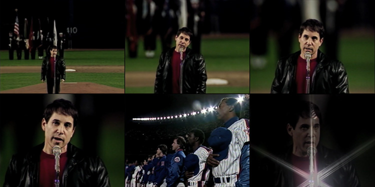 Comentarios: Paul Simon canta el "Star Spangled Banner" (himno americano) en el Shea Stadium de New York antes del sexto partido, de los siete jugados, en la final de la liga de béisbol de 1986 entre los New York Mets y los Red Sox.