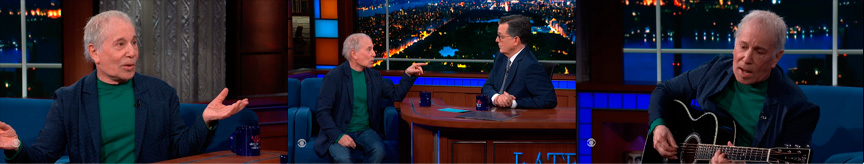 Comentarios: Simon vuelve al show de Stephen Colbert que le realiza una amplia entrevista, fue el único invitado del programa, donde contó anécdotas y abordo temas como su amor desde la infancia por el rock and roll, sus propias canciones favoritas (y menos favoritas), el proceso de escritura de una de sus composiciones favoritas, "Darling Lorraine", y el sueño que inspiró su último álbum, Seven Psalms. Paul también habló de la precipitada pérdida auditiva que ha sufrido en su oído izquierdo, y de la investigación médica y los avances que se están realizando a través de la Iniciativa de Stanford para Curar la Pérdida Auditiva.