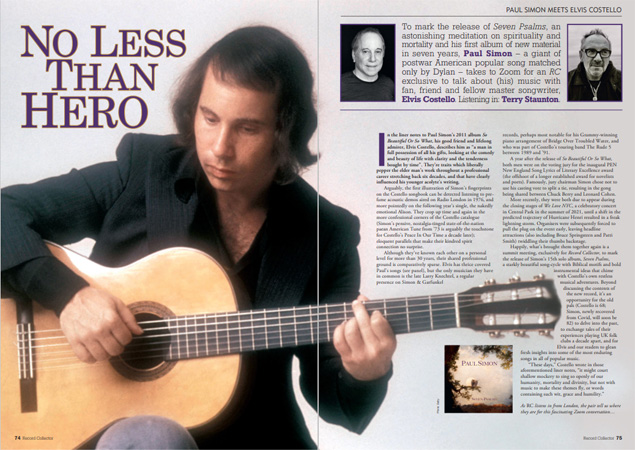 Para marcar el lanzamiento de Seven Psalms, una asombrosa meditación sobre la espiritualidad y la mortalidad y su primer álbum con material nuevo en siete años, Paul Simon, un gigante de la canción popular estadounidense de la posguerra solo igualado por Dylan, recurre a Zoom para hablar en exclusiva con Record Collector sobre (su) música con el admirador, amigo y su colega maestro compositor, Elvis Costello. Escuchando: Terry Staunton.