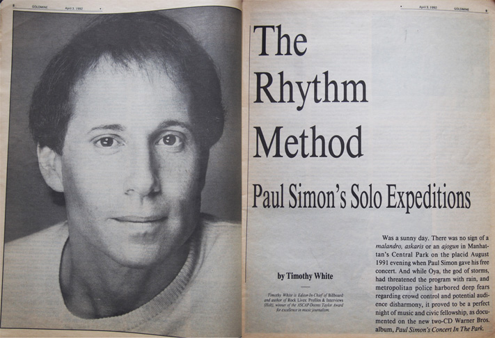 Era un día soleado. No había ni rastro de malandro, askaris o ajogún en el Central Park de Manhattan la plácida noche de agosto de 1991 en que Paul Simon ofreció su concierto gratuito. Y aunque Oya, el dios de las tormentas, había amenazado el concierto con lluvia, y la policía metropolitana albergaba profundos temores sobre el control de multitudes y la posible discordia entre el público, resultó ser una noche perfecta de música y camaradería cívica, como se documenta en el nuevo álbum de dos CD de Warner Bros, Paul Simon's Concert In The Park.
