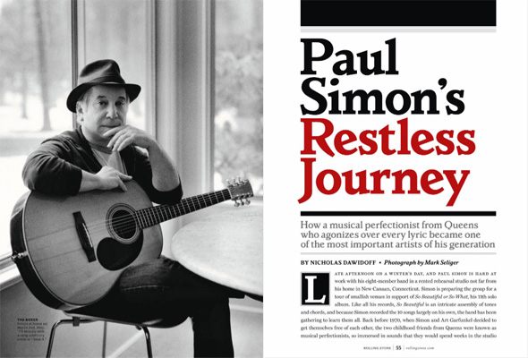 Tarde de un día de invierno, Paul Simon trabaja duro con su banda de ocho miembros en un local de ensayo alquilado no lejos de su casa de New Canaan, Connecticut. Simon está preparando al grupo para una gira por pequeños auditorios en apoyo de So Beautiful or So What, su undécimo álbum en solitario. Como todos sus discos, So Beautiful es un intrincado ensamblaje de tonos y acordes, y como Simon grabó las 10 canciones en gran parte por su cuenta, la banda se ha reunido para aprendérselas todas. Antes de 1970, cuando Simon y Art Garfunkel decidieron liberarse el uno del otro, los dos amigos de la infancia de Queens tenían fama de perfeccionistas musicales, tan inmersos en los sonidos que se pasaban semanas en el estudio grabando una sola canción nueva como "The Boxer". Simon ha cumplido ahora casi seis años desde la mañana en que su viejo amigo Paul McCartney le telefoneó para decirle: "Lo siento, pero esto hay que hacerlo", y le cantó "When I'm Sixty-Four", pero nada ha cambiado en su forma de entender la música. Lo que explica por qué su percusionista y su guitarrista principal están ahora mismo de rodillas, acurrucados, con los oídos pegados a un gran altavoz, intentando identificar ese misterioso ruido de repiqueteo.