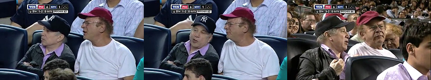 Comentarios: Simon y Garfunkel son enfocados por las cámaras durante el partido de béisbol entre los Yankees de Nueva York y los Philadelphia Phillies en el Yankee Stadium en Nueva York. Se da la casualidad que Simon es un incondicional de los NY Yankees y que Garfunkel, aunque neoyorquino, es fiel seguidor de los Phillies. El partido quedo 3-6 para el equipo de Garfunkel.
