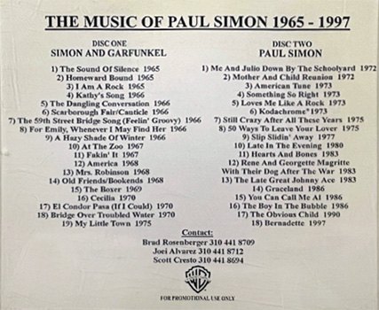 Doble CD promocional publicado por Warner. Se trata de un recopilatorio donde el primer CD contiene material de Simon & Garfunkel y el segundo de Paul Simon en solitario. Muy raro y difícil de conseguir.