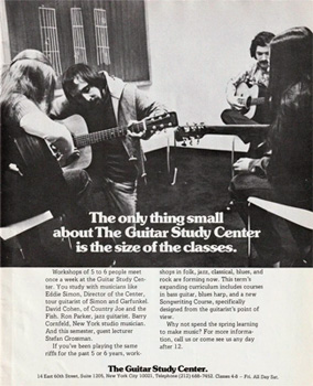 Paul da clases en "The Guitar Study Center" a mediados de los setenta. A la derecha anuncio de la academia.